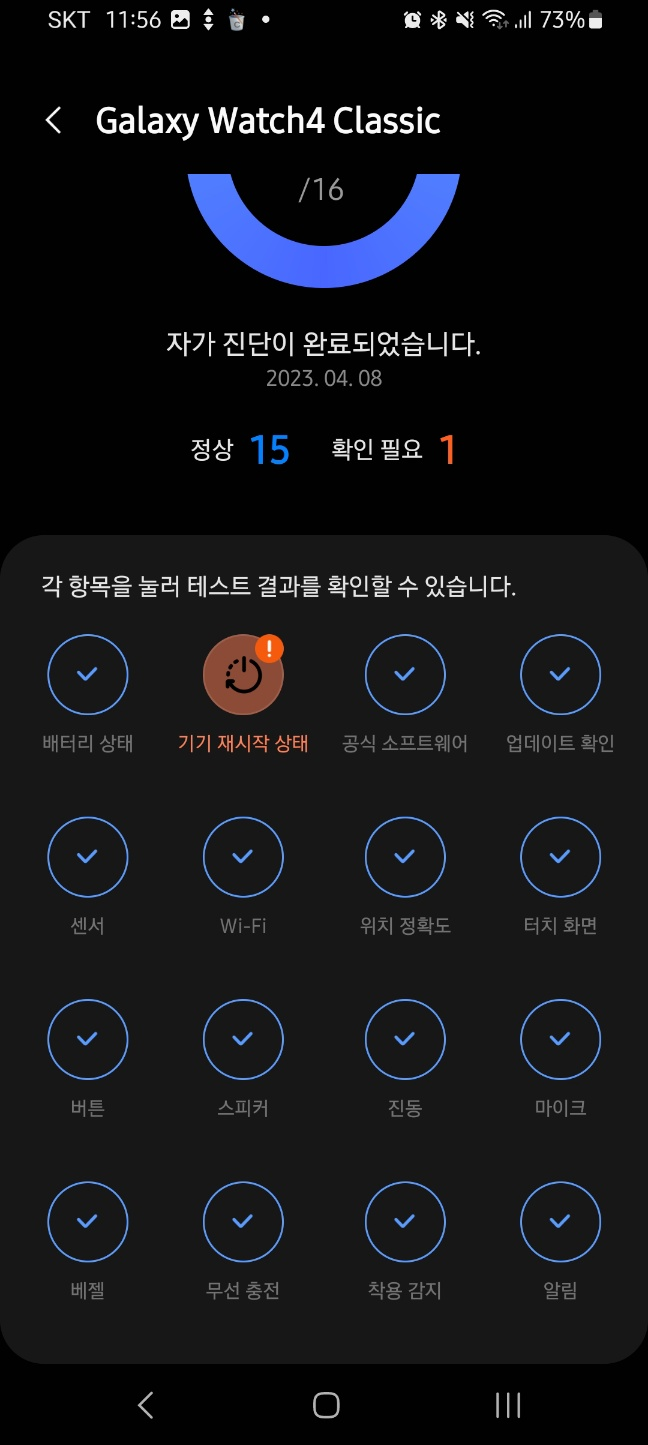 총 16개 항목을 테스트할 수 있는데, 베젤이 없는 갤워치4 일반이나 갤워치5에서는 이 항목을 테스트할 수 없습니다. 갤워치4클래식에만 존재합니다.